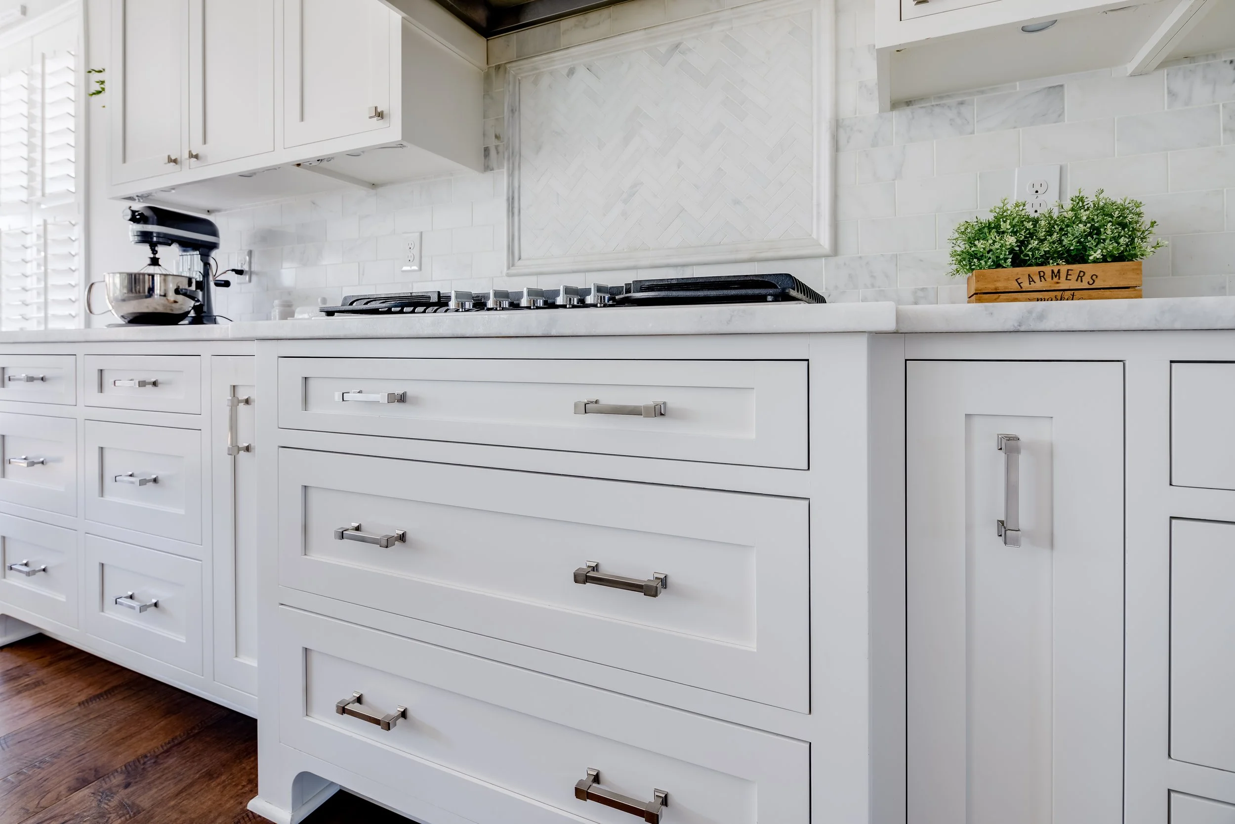 Modern kitchen with white cabinetry, marble backsplash, stainless steel stove, and gold accents.